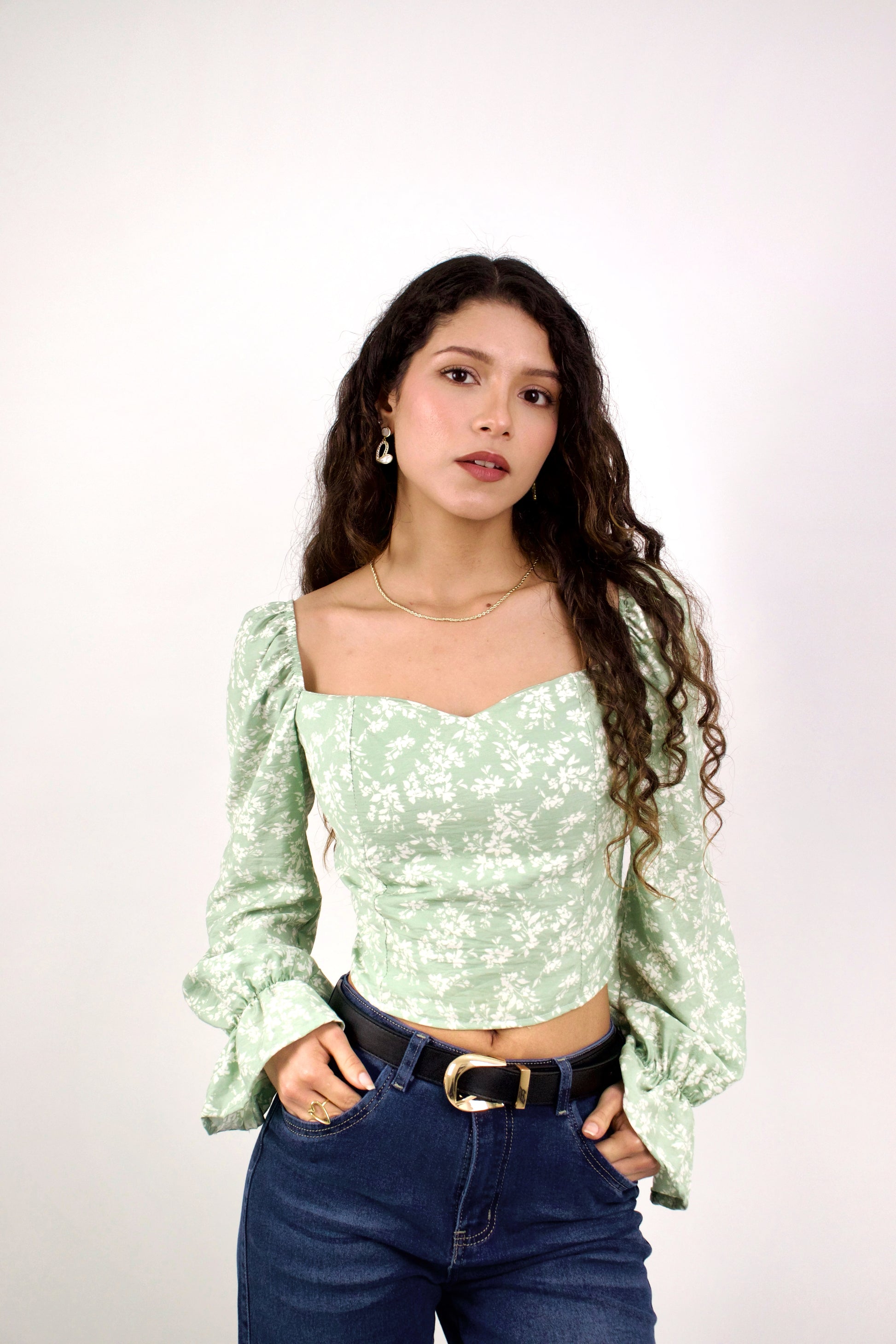 Una blusa con carácter que resalta tu esencia. Su diseño tipo corset con manga larga abultada aporta estructura y romanticismo a cualquier look.